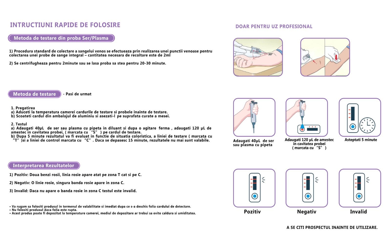 - LINIA T – daca se coloreaza doar linia din dreptul literei T inseamna ca testul nu este valid, fiind iesit din parametri si se recomanda utilizarea unui nou kit de testare